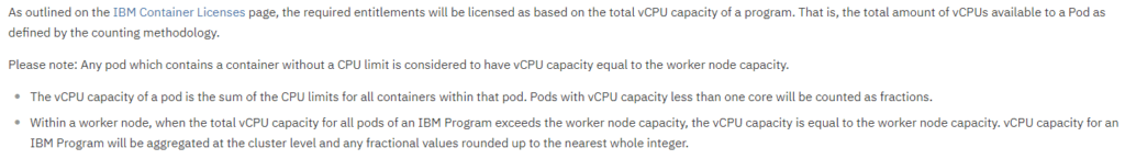 Zur Ermittlung der “vCPU capacity” in Containern muss das IBM License Service Tool verwendet werden, das nicht das IBM License Metric Tool ersetzt. Wird das Tool nicht verwendet, werden alle verfügbaren Cores im Cluster gezählt und müssen entsprechend lizenziert werden.